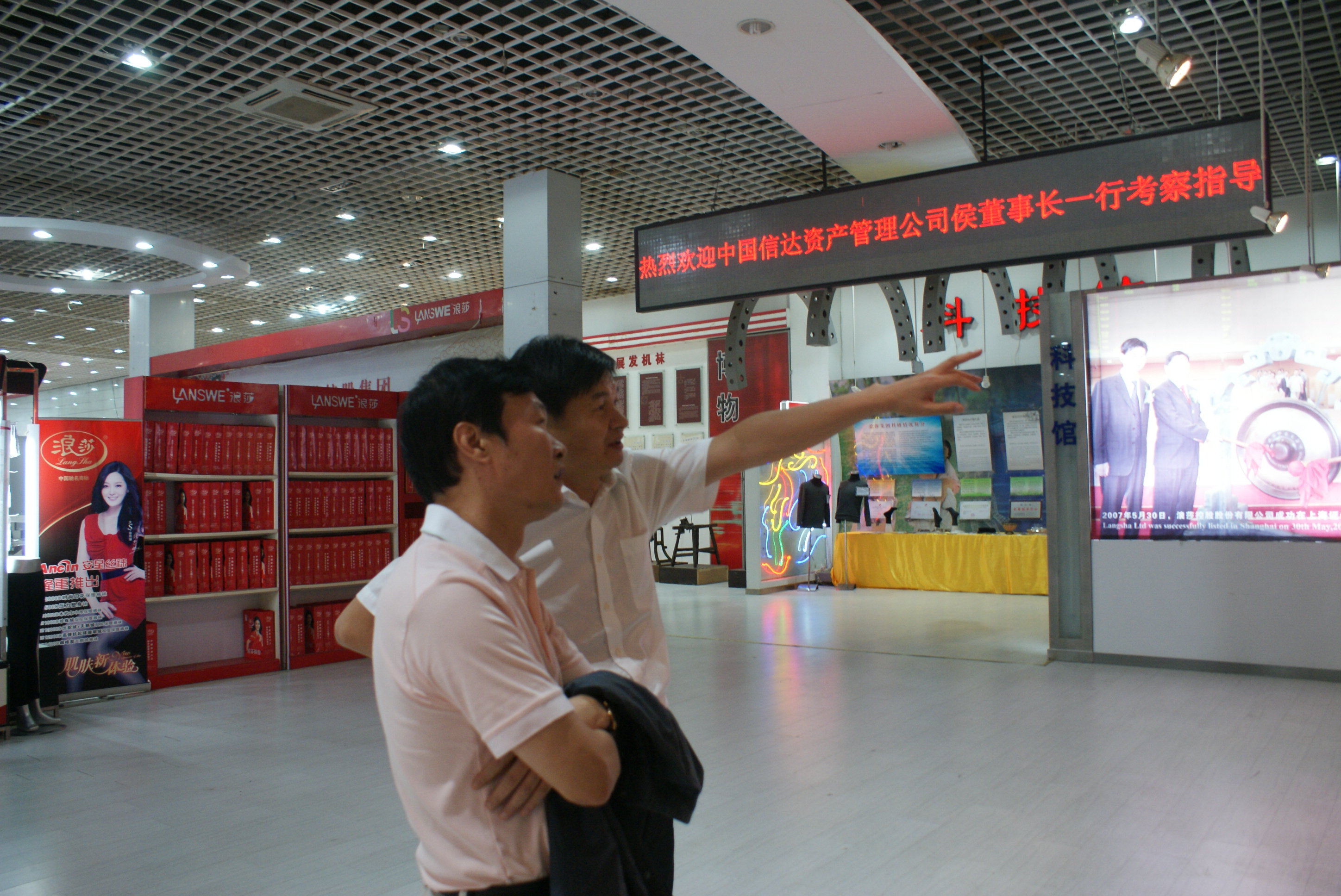 2012年10月8日中國信達資產管理公司侯董事長一行在浪莎參觀考察,公司總裁翁榮弟親自接待。侯董事長在翁總裁的介紹中參觀了浪莎產品展覽中心,了解了浪莎集團的發展歷史和現狀。